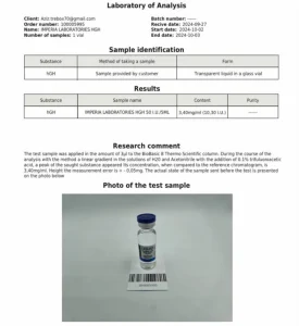 Imperia Liquid 50UI produz excelentes resultados, é uma das melhores soluções para adquirir um corpo musculado e definido. É utilizado por atletas e fisiculturistas de todo o mundo para crescer e manter a massa muscular. Esta somatropina possui inúmeros componentes benéficos que auxiliam na produção de hormônio de crescimento em humanos, bem como na queima rápida de gordura. É um produto cómodo e versátil, que é novo no mercado, e conta com um nível de pureza absolutamente incrível estando a um preço bastante competitivo se tivermos em conta a sua elevada qualidade. Como se pode observar no teste laboratorial em baixo, foi retirado de um frasco da Liquid, 1 ml da solução para análise e foram encontrados 10,30 UI (103% de pureza).